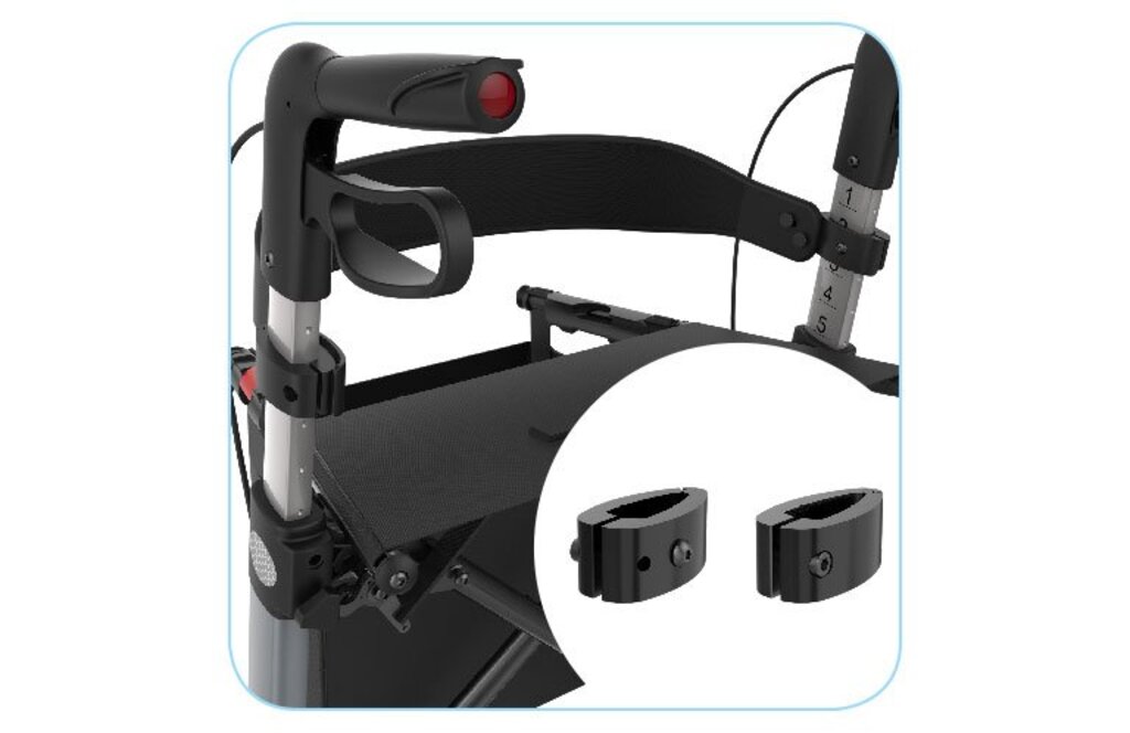 Ruggordel, de rugleuning ondersteunt het onderste deel van de rug wanneer men op de rollator zit. Vergrendel altijd de remmen door de hendels naar beneden vast te zetten.