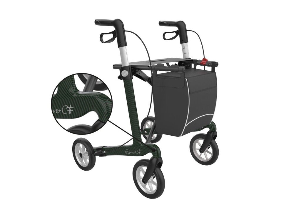 Server CF Rollator Carbon Fiber Technologie De Server CF rollator vertegenwoordigt de elegantie en de prestaties van de Rehasense rollators. Met een laagst gewicht tot minimaal 5 kg voor de kleinste versie kan de Server CF tot 150 kg belast worden. Zeer uitgebalanceerd ontwerp, optimaal rechtstandig op te tillen.