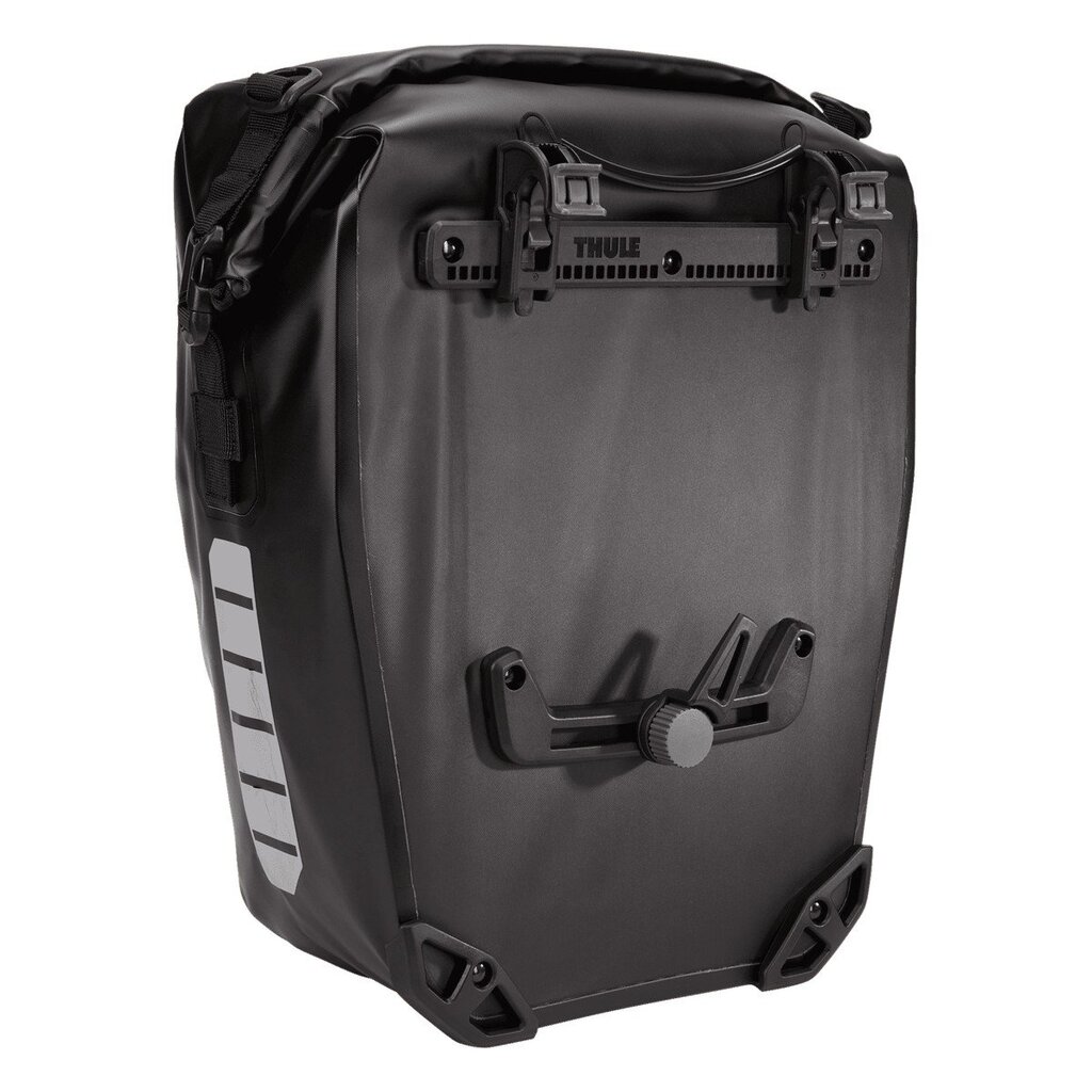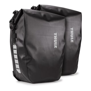 THULE PACK'N PEDAL tas "Shield Pannier Large" Per paar, volume: 2x 25 l, maten (L x B x H): 37 x 20 x 40 cm, nylon, montage op bagagedrager Waterdicht, gebruiksvriendelijk, veilig en vibratievrij bevestigingssysteem, verschillende draagmogelijkheden dankzij geďntegreerde hengsel en afneembare schouderriemen. Met rolsluiting, bevestigingspunten voor verlichting, binnenvakken voor het opbergen van kleine voorwerpen. Reflex-applicaties op voor- en zijkanten, gewicht: 2,9 kg per stuk, past op alle Thule bagagedragers, evenals bijna alle andere bagagedragers i.› zwart, Mod. 25